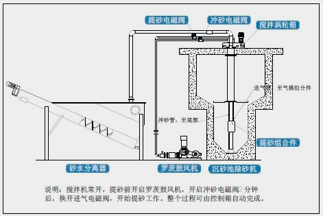 由于葉輪葉漿向上傾斜,旋轉(zhuǎn)時(shí)將使池中的污水呈螺旋狀加速,形成渦流態(tài),產(chǎn)生留心力。同時(shí)池內(nèi)污水流在葉輪葉片攪拌剪切力的作用下,互相剝離,依靠砂的自身重力和旋流的離心力,使砂粒沿池壁呈螺旋線(xiàn)加速沉降,向中心砂斗積聚,經(jīng)氣提或泵提升后排出池外作進(jìn)一步的處理。在此過(guò)程中,適當(dāng)?shù)臉~角度和線(xiàn)速度條件,使污水中的砂粒受到?jīng)_刷,并保持好的沉降效果,而原來(lái)粘附在砂粒上的有機(jī)物,以及重量小的物質(zhì),隨污水一同流出旋流沉砂池,進(jìn)入后續(xù)工序繼續(xù)處理,砂與少量污水進(jìn)入池外砂水分離器內(nèi),砂經(jīng)分離后外排,污水回流至格柵井。
